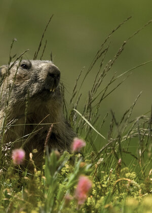Tra i mammiferi invece immancabile è la Marmotta Alpina, roditore di media grandezza che si può osservare facilmente e che vive in gruppi familiari passando l’inverno e le ore notturne o troppo calde dell’estate nel sistema di tane scavato nel proprio territorio. Potrete poi riconoscere facilmente la sua presenza dal fischio di allarme, lanciato in situazioni di pericolo come la presenza troppo prossima di voi umani o la presenza di predatori come la Volpe e l’Aquila.